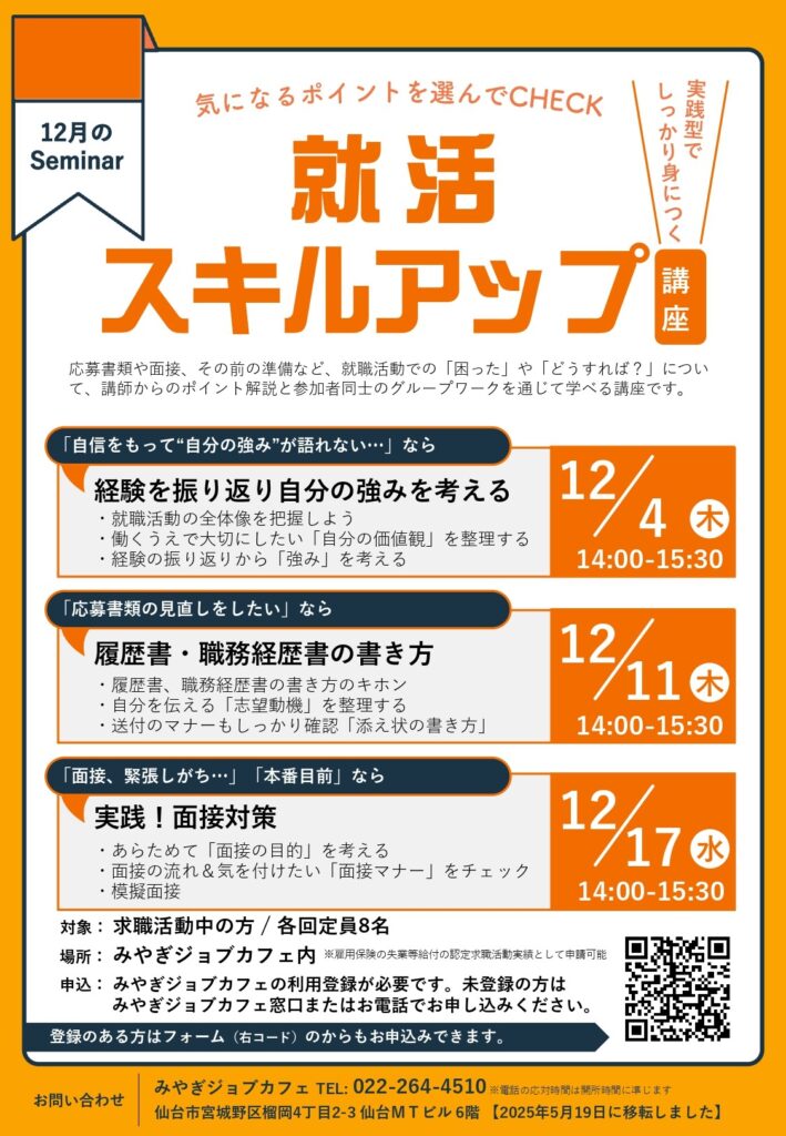 応募書類や面接、その前の準備など、就職活動での「困った」や「どうすれば?」を解決しませんか。 3つのテーマで就職活動について確認ができる「就活スキルアップ講座」は、気になるテーマだけ選んで参加しても、まるっと3テーマ参加してもどちらもOK!ぜひご参加・ご活用ください。