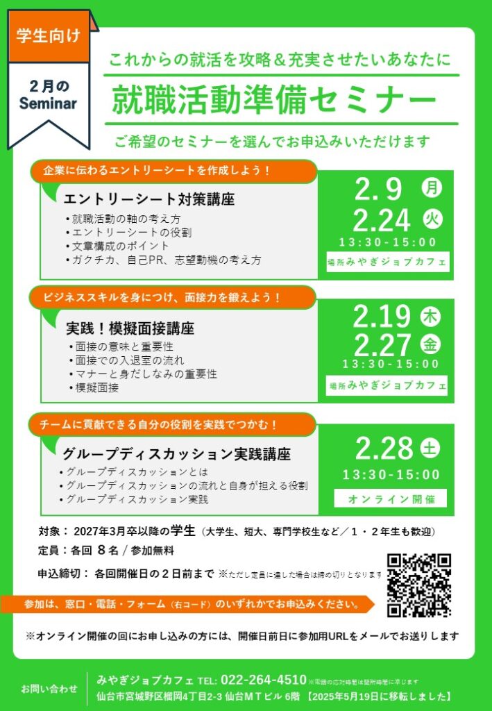 2/24(火)開催|学生向け|エントリーシート対策講座|就職活動準備セミナー③ ご希望のセミナーを選んでお申込みいただけます