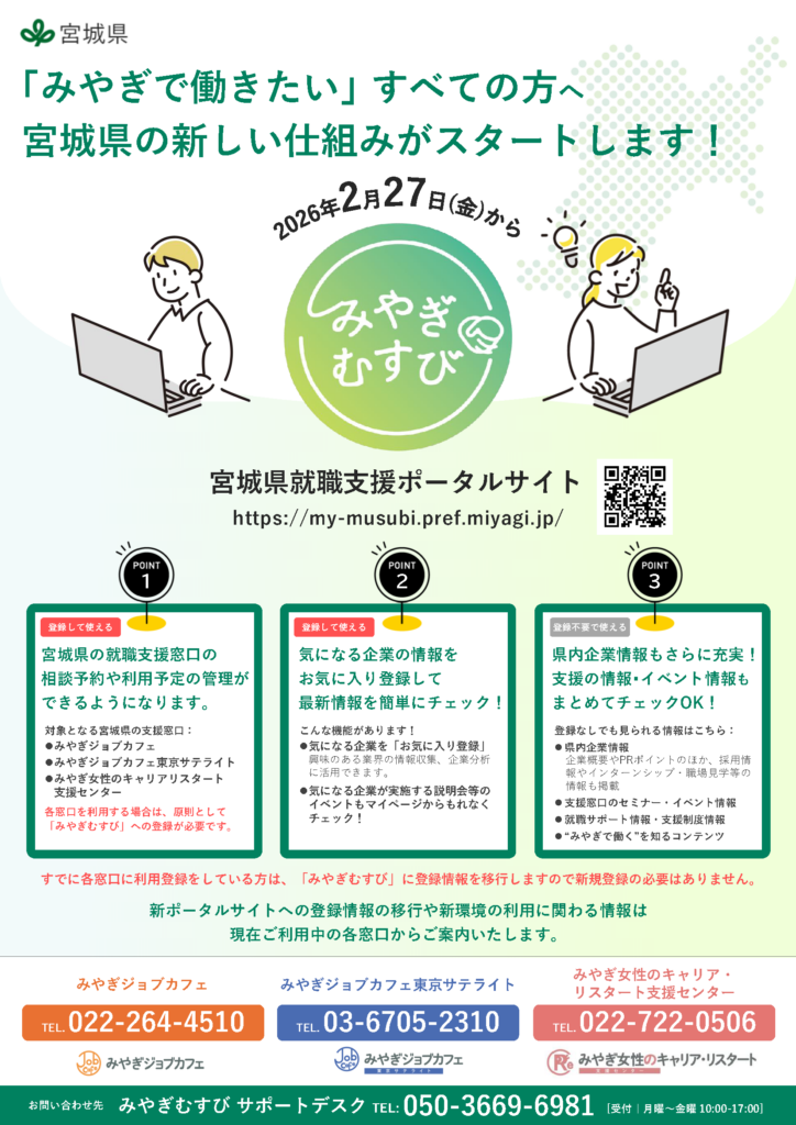 このたび宮城県では、仕事や就職活動に関わる支援情報や県内企業に関するさまざまな情報を一元的に発信し、ご利用する皆様がこれまで以上に活用できる環境をつくることを目的に、宮城県就職支援ポータルサイト「みやぎむすび」を2026年2月27日(金)より、スタートする運びとなりました。
